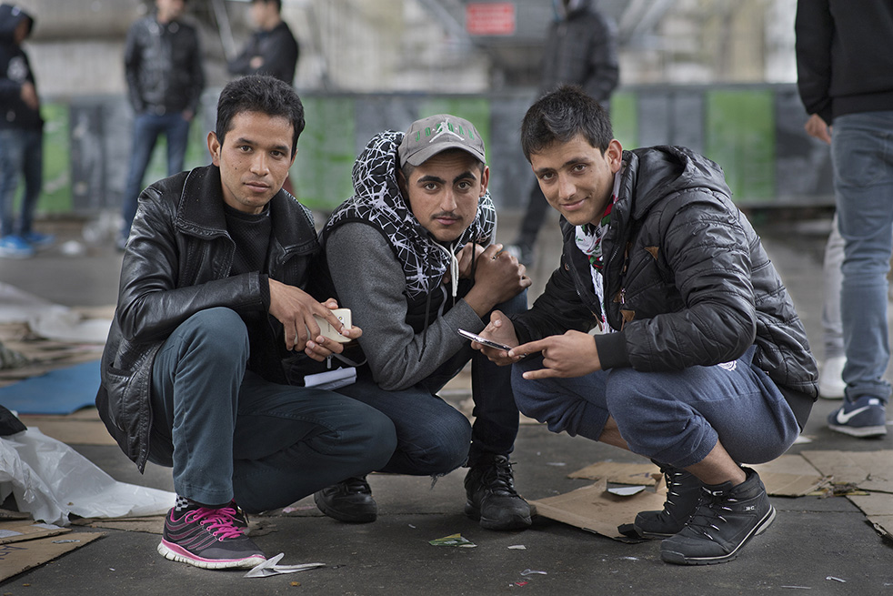 Trois jeunes afghans prennent la pose dans le nouveau camp de Stalingrad.